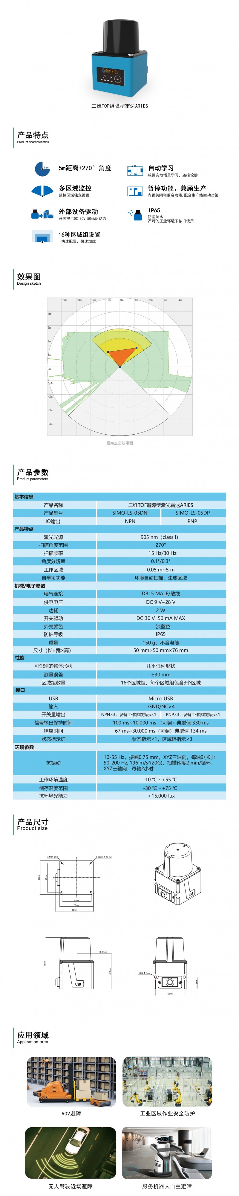 ARIES避障型激光雷達(dá)是星秒繼導(dǎo)航型雷達(dá)后研制出的一款用于服務(wù)機器人、智能工廠區(qū)域安全防護(hù)領(lǐng)域等避障型雷達(dá)。它可實現(xiàn)5m距離,270°角度,多區(qū)域監(jiān)控獨立設(shè)置,16種區(qū)域組設(shè)置可快速配置,快速加載;還可根據(jù)實地場景自動學(xué)習(xí),監(jiān)控輪廓;內(nèi)置關(guān)閉和重啟功能,配合生產(chǎn)線搬動對策;防護(hù)等級IP65,即使在嚴(yán)苛的工業(yè)環(huán)境下依舊適用。