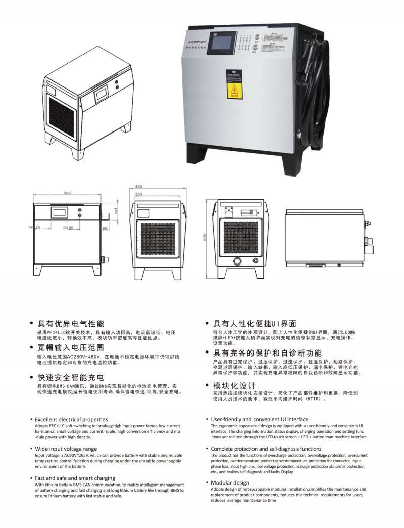 觸摸屏智能操作設(shè)計:告別傳統(tǒng)按鍵方式,給您帶來更現(xiàn)代更具科技智能的操作體驗 自動充電:插槍自動充電,簡化充電流程,便于操作 兼容性高:80V200A兼容48V200A充電 多重保護(hù): 輸出短路,過流過壓保護(hù),反接保護(hù),電流導(dǎo)管保護(hù)等多重保護(hù) 預(yù)約充電功能:避開高峰用電時段,有效節(jié)省成本 雙語切換:中英文雙語隨需切換,跨越語言障礙,與世界接軌 人性化設(shè)計:充電機(jī)背板內(nèi)部附部件明細(xì)及產(chǎn)品接線圖,方便客戶可更清楚的了解產(chǎn)品,便于維修,提高售后時效 獨特設(shè)計: 內(nèi)置電磁鎖驅(qū)動模塊,防止臨時斷電鎖槍 使用壽命更長:功率模塊預(yù)留20%空間,提高模塊的使用壽命 出色內(nèi)部結(jié)構(gòu): 內(nèi)部結(jié)構(gòu)左右出風(fēng),內(nèi)部電路不容易積粉塵,提高充電機(jī)壽命