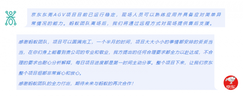 從售前方案制作到項目交付,螞蟻機器人一直兢兢業(yè)業(yè),用專業(yè)和敬業(yè)為項目畫上一個完美的句號,并得到了客戶的一致點贊。螞蟻機器人為京東量身打造的柔性物流解決方案,顯著提升了改造倉的物流服務質(zhì)量,助力京東物流創(chuàng)造更大的價值。
