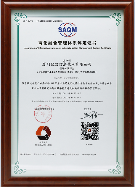 兩化融合管理體系評定證書