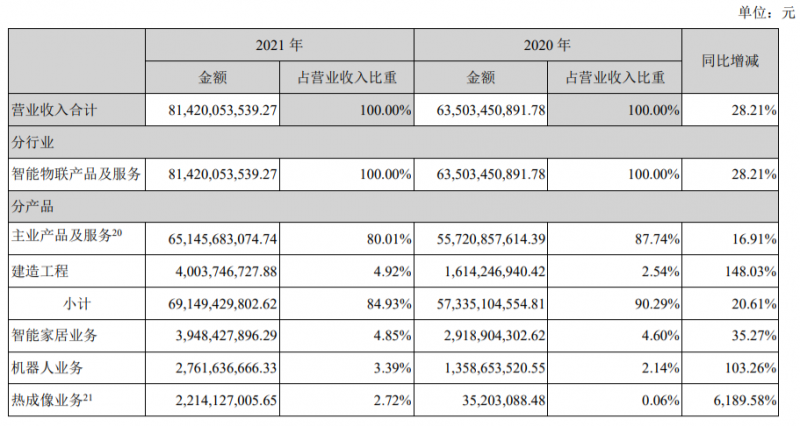 2015年以來,海康威視鼓勵內(nèi)部員工創(chuàng)新創(chuàng)業(yè),建立內(nèi)部創(chuàng)新跟投制度,先后成立了8個創(chuàng)新業(yè)務。2021年,有5個創(chuàng)新業(yè)務的收入超過10億、凈利潤為正。其中,公司智能家居業(yè)務營收達到了39億元,同比增長35.27%、機器人業(yè)務營收達到了27億元,同比增長103%、熱成像業(yè)務營收達到22億元、同比增長6189.58%。年報顯示,螢石網(wǎng)絡已經(jīng)遞交IPO申請;海康機器人擬分拆上市,相關籌備工作正在推進中。