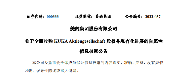 2022年3月,美的集團發布公告稱,根據德國當地相關法律法規的要求,本次收購的價格以評估方式確定,經評估,本次收購價格為 80.77歐元/股,合計收購總價款為15,052.25萬歐元。