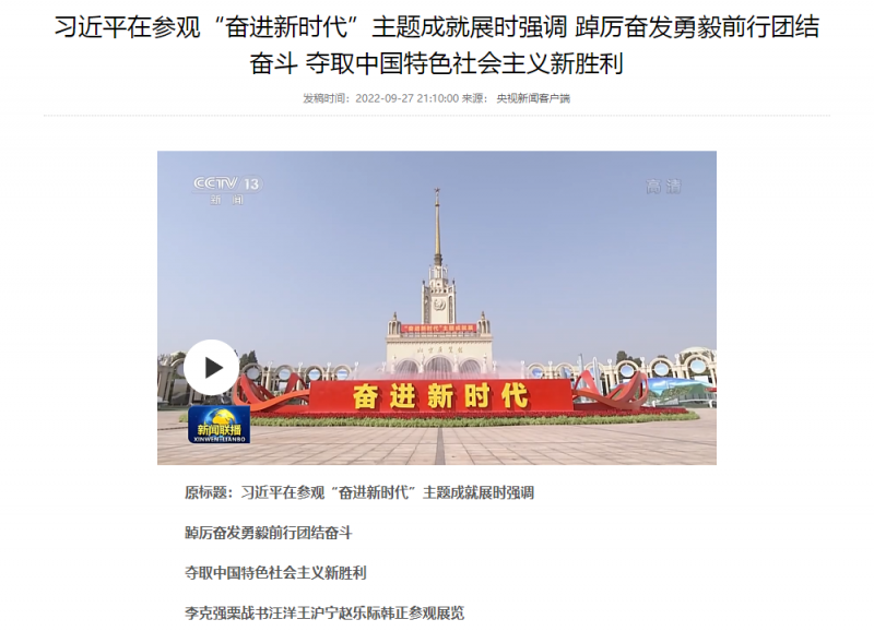 核心提示:9月27日,奮進(jìn)新時(shí)代主題成就展在北京展覽館開(kāi)幕。截圖來(lái)源央視新聞客戶(hù)端聚焦新時(shí)代10年來(lái)國(guó)家的偉大成就變革,展覽宣傳了10年