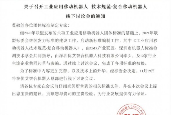 關(guān)于召開(kāi)《工業(yè)應(yīng)用移動(dòng)機(jī)器人 技術(shù)規(guī)范-復(fù)合移動(dòng)機(jī)器人》線下討論會(huì)的通知