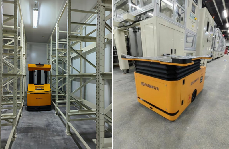 助力客戶實(shí)現(xiàn)了車間物料無人化運(yùn)輸及自動(dòng)上下料,有效減少了人工,進(jìn)一步提升了生產(chǎn)效率。三、創(chuàng)智科技-數(shù)碼電池后工序智能物流項(xiàng)目本次項(xiàng)目范圍為注液后到包裝出電芯成品的數(shù)個(gè)工序,通過專用AGV完成工序間接駁;側(cè)叉式AGV完成高溫房、常溫房自動(dòng)出入庫和智能化倉儲管理。其中,高溫房常年維持在50℃高溫環(huán)境中,傳統(tǒng)的人工搬運(yùn)出,作業(yè)員需穿戴防護(hù)服,工作不便效率低下,且勞動(dòng)強(qiáng)度高,由此,即影響生產(chǎn)效率,同時(shí)人員流失率高。創(chuàng)智科技通過創(chuàng)新研發(fā),開發(fā)出了高溫房專用側(cè)叉式AGV,其使用物流通道小,使用庫容高;結(jié)合WMS倉庫管理系統(tǒng),實(shí)現(xiàn)了高溫靜置工序無人化、信息化。