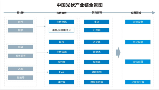 在2021年度近7500億的光伏投資規模中,單個投資規模在億元以上的光伏項目已超130個,10億元以上的項目近100個,100億元以上的項目約有25個。其中全產業鏈一體化項目投資規模近2000億,每個項目投資手筆動不動就是幾百億,電池和組件環節的投資擴張有過之而不及,億元以上的項目超過60個,約7個項目投資預算在100億元以上。2022上半年,光伏產能投資超過了6000億,特別是龍頭企業動輒百億的投資(公告)頻頻出現,跨界者持續涌入,產能投資還在提速。光伏產業的擴產風潮給設備廠商帶來了巨大的機遇,光伏產業鏈中,上游為原材料,主要包括硅片、銀漿、純堿、石英砂等;中游為光伏電池板及光伏組件生產;下游為光伏的應用領域,光伏主要用來發電,還可以代替燃料用來取暖等。