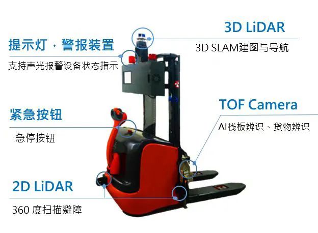 據(jù)了解,當前市場上大部分無人叉車以2D激光雷達導(dǎo)航為主,此種導(dǎo)航方式掃描速度快、分辨率強、可靠性高,在測試周圍障礙物的距離和精度上比較精準。但2D激光雷達僅能掃描一個平面,建立的2D地圖特征信息少,較難解決全局定位問題。同時,成像缺乏高度信息,難以識別懸空障礙物,只能應(yīng)用于布局相對簡單、固定的室內(nèi)場景,難以滿足無人叉車在復(fù)雜場景的導(dǎo)航定位需求。