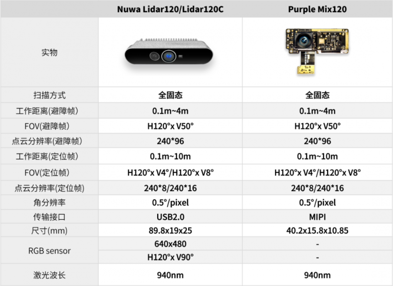 產品將重點針對機器人應用領域,有效解決導航、避障功能模塊分離造成的機器人整機產品形態(tài)設計困難、傳感模塊多而成本高的問題。此外,傳統(tǒng)的LDS、單點/多點dToF線掃導航模塊都需要采用機械式或半固態(tài)的設計,可靠性易受影響,而Nuwa-Lidar120和PurpleMix120都采用了全固態(tài)的方案,產品內部沒有任何的機械振動和微機械振動,是針對產品可靠性和壽命優(yōu)化最理想的方案之一。
