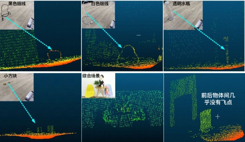 實拍場景與3D點云,可以看到dToF不僅在綜合場景中表現(xiàn)優(yōu)秀,對小物體,細線甚至透明物體等極端場景都有非常好的表現(xiàn),并且相對于其他ToF技術,dToF在飛點(前后物體邊界難以區(qū)分造成的)的表現(xiàn)上有天然優(yōu)勢。![]()