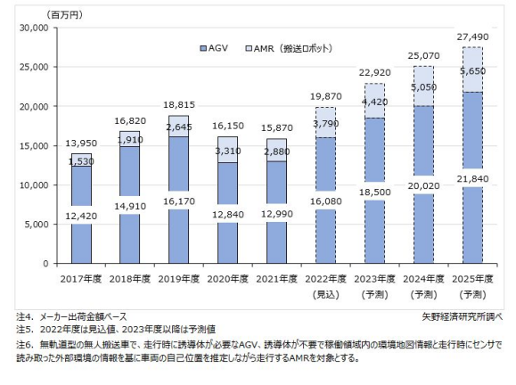 預(yù)計(jì)22財(cái)年日本AGV/AMR的市場(chǎng)規(guī)模(制造商出貨量)為7700臺(tái)(同比增長(zhǎng)20.3%),銷售額為198.7億日元(同比增長(zhǎng)25.2%)。雖然半導(dǎo)體短缺的影響仍在繼續(xù),但制造商在前一年努力改善和加強(qiáng)供應(yīng)系統(tǒng)是積極因素,預(yù)計(jì)三年來(lái)首次出現(xiàn)增長(zhǎng)。