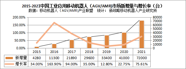 2015-2021中國(guó)市場(chǎng)企業(yè)工業(yè)應(yīng)用移動(dòng)機(jī)器人(AGV/AMR)新增量(臺(tái))與增長(zhǎng)率