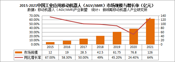 2015-2021中國(guó)工業(yè)應(yīng)用移動(dòng)機(jī)器人(AGV/AMR)市場(chǎng)規(guī)模(億元)與增長(zhǎng)率