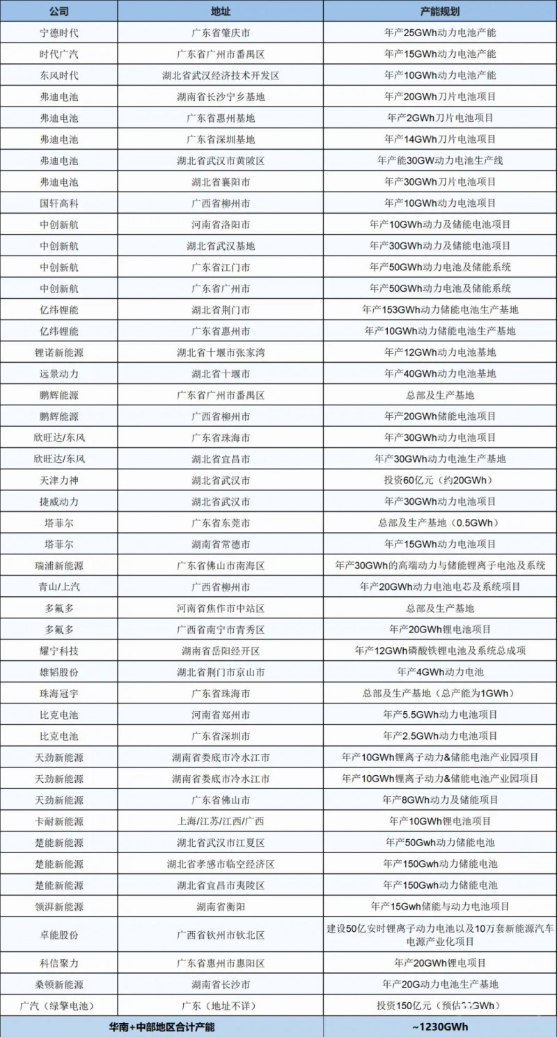 全國動力與儲能電池基地產能統(tǒng)計表3---華南+中部地區(qū)
