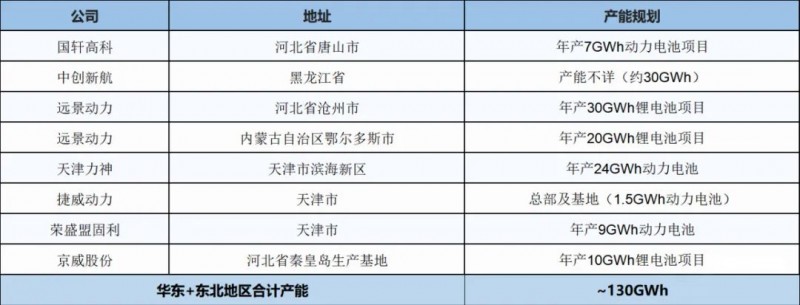 全國動力與儲能電池基地產能統(tǒng)計表2---華北+東北地區(qū)