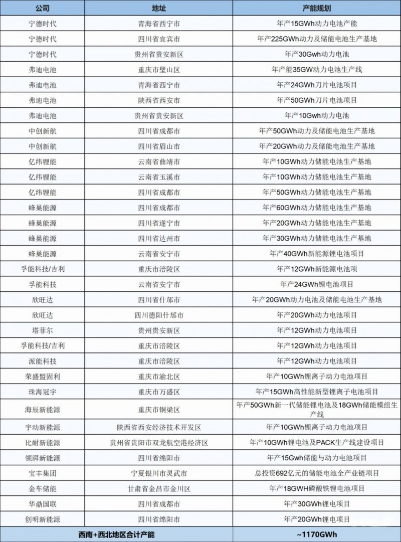 全國動力與儲能電池基地產能統(tǒng)計表4---西南+西北地區(qū)