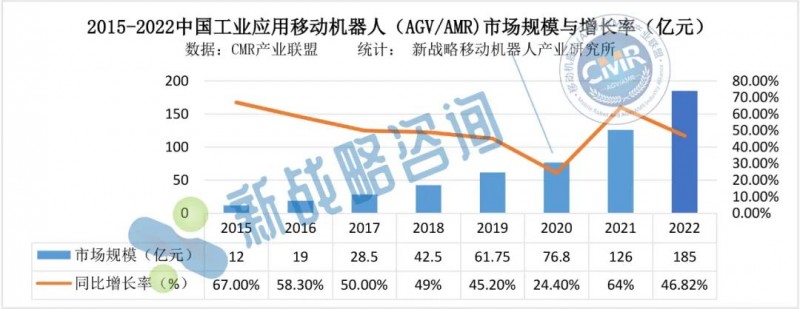 2015-2022中國工業(yè)應(yīng)用移動(dòng)機(jī)器人(AGV/AMR)市場規(guī)模與增長率