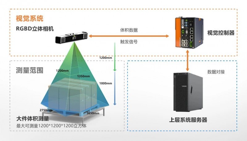 測量精度:±10mm,針對倉儲物流,碼垛類型的超大件物體進行體積測量。