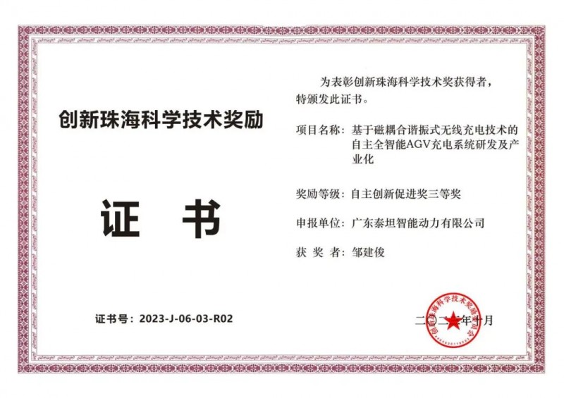 讓我們共同祝賀廣東泰坦智能動(dòng)力有限公司獲得2023年度創(chuàng)新珠??茖W(xué)技術(shù)獎(jiǎng)-自主創(chuàng)新促進(jìn)獎(jiǎng)三等獎(jiǎng)以及2023年度珠海市科技創(chuàng)新產(chǎn)品獎(jiǎng),并期待我們未來在新能源領(lǐng)域繼續(xù)取得更多突破和成就!