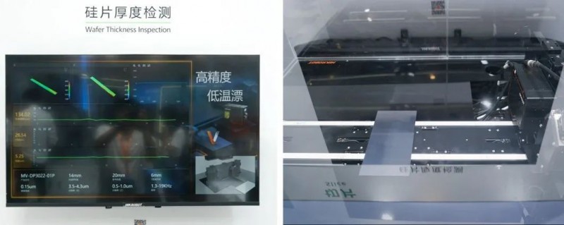 該環(huán)節(jié)還展示了硅片厚度/側(cè)邊檢測(cè)方案。其中,六臺(tái)3D激光輪廓傳感器測(cè)試硅片厚度,六臺(tái)相機(jī)兩兩對(duì)射,同時(shí)測(cè)量三組數(shù)據(jù)結(jié)果。硅片平均厚度數(shù)據(jù)重復(fù)性精度≤0.5μm,TTV(單線厚度波動(dòng))重復(fù)性精度≤1.5μm,線痕(單線輪廓高度)重復(fù)性精度≤2μm。