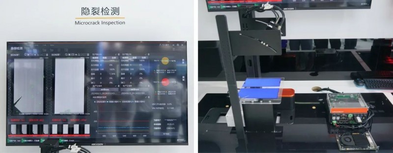 其中,隱裂檢測(cè)方案使用“4k黑白線陣相機(jī)+大靶面短波紅外鏡頭+穿透式近紅外線激光光源”,可對(duì)0.5mm以上尺寸的脫晶、崩邊、破片、隱裂以及疊片、臟污進(jìn)行檢出與分類;在數(shù)據(jù)處理上,采用了新發(fā)布的SVA智能視覺處理卡方案,將軟件的大部分傳統(tǒng)算法與深度學(xué)習(xí)檢測(cè)模塊轉(zhuǎn)入這張采集卡內(nèi)工作,極大降低了工控機(jī)的硬件資源占用。