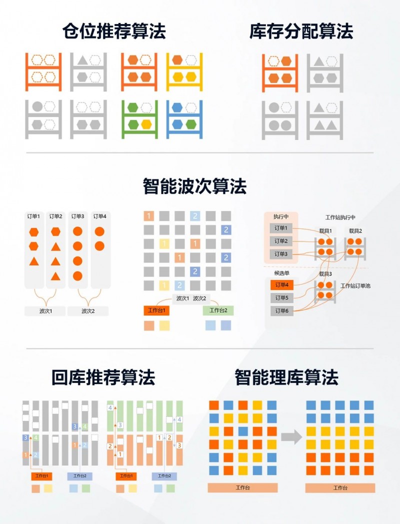 基于AI和深度學習,iWMS-Logistics融合五大智能算法。入庫環節倉位推薦算法,讓物料入庫合理分布;智能波次算法搭配庫存分配算法,考慮優先級、庫存分布、關聯性等因素,實現庫存最優分配和出庫站點均衡指派,助力日上免稅行實現日最大出庫15W行;智能理庫算法,在非作業時間段,由AMR智能理庫,使每個器具調整到最佳倉位,提高出庫效率。