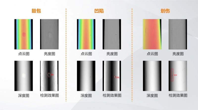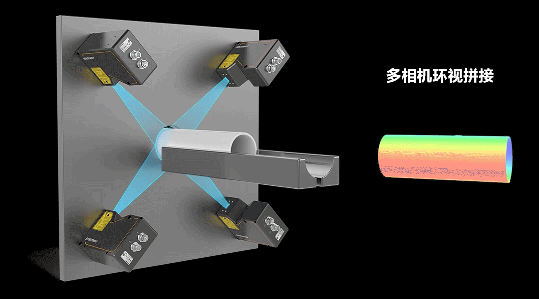 相比傳統(tǒng)游標卡尺/測徑儀的測量方式,環(huán)視拼接可實現(xiàn)物料在線、非接觸式直徑測量和表面缺陷檢測;相比單輪廓傳感器方案,獲取信息更加全面,效率更高。