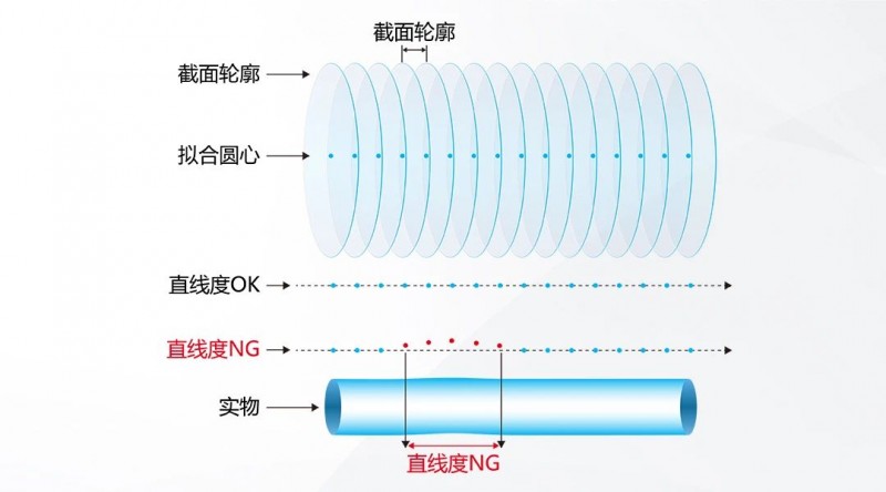 通過對截面數(shù)據(jù)的分析,可以計算出不同截面位置的圓心點坐標,進而實時監(jiān)控線纜/管材直線度,當圓心坐標跳動超出一定閾值時,則判定線纜/管材某位置處發(fā)生彎折。
