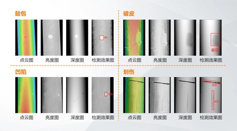 通過多相機環(huán)視拼接,可實現(xiàn)線纜/管材外表面點云數(shù)據(jù)的采集,通過VM 3D軟件,可對線纜/管材表面鼓包、破皮、凹陷、劃傷等缺陷進行有效檢出。