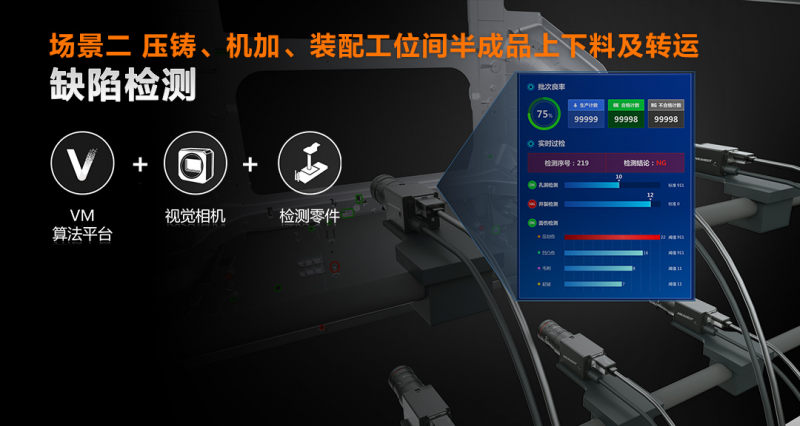 海康機(jī)器人利用工業(yè)相機(jī),并通過VM算法平臺,實現(xiàn)高效缺陷檢出。對于壓鑄件,能夠檢測出凸起、缺料、多料、裂紋和碰劃傷等缺陷;在機(jī)加和裝配環(huán)節(jié),檢測內(nèi)容包括孔洞有無、通孔是否打通、螺紋孔質(zhì)量、預(yù)鑄孔加工面和倒角等。