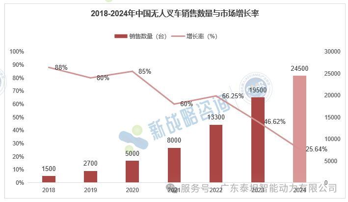 2024年,中國無人叉車市場交出了一份亮眼答卷——根據移動機器人產業聯盟數據顯示,2024年,中國市場無人叉車全年銷量達24,500臺,同比增長25.64%,在移動機器人整體市場中銷售占比為17.63%,成為移動機器人領域增長最快的細分賽道之一。