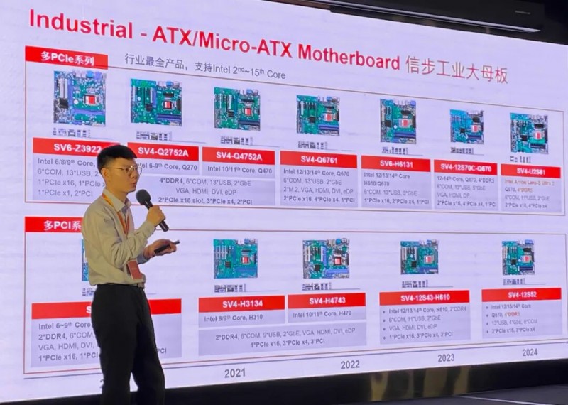 會(huì)上,葉總全面展示了信步的信創(chuàng)和ARM平臺(tái)的主板產(chǎn)品矩陣。多款不同平臺(tái)的信步工控主板已成為國(guó)家重點(diǎn)工程和新興行業(yè)產(chǎn)品的算力基石。