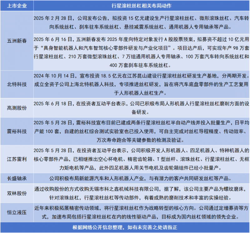 近日,五洲新春、雙林股份、震??萍肌⒈碧乜萍肌㈤L盛軸承等多家零部件上市公司都在加速布局轉型行星滾柱絲杠領域,相關企業合計規劃投資金額已超過60億元。