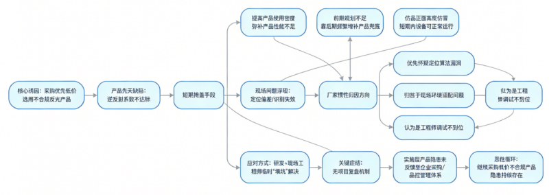 更關(guān)鍵的是,當(dāng)設(shè)備出現(xiàn)定位偏差等問題時,設(shè)備廠家的第一反應(yīng)往往是懷疑定位算法,習(xí)慣性依靠研發(fā)與現(xiàn)場工程師的經(jīng)驗去“填坑”。這種就事論事的解決思路,導(dǎo)致實施層面暴露的產(chǎn)品隱患,很難通過項目復(fù)盤反思,反饋到企業(yè)的整體采購管理與品控體系中,最終形成 “治標(biāo)不治本” 的惡性循環(huán)。