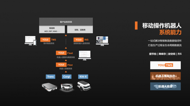 優(yōu)艾智合是國(guó)內(nèi)最早布局軟件系統(tǒng)的移動(dòng)機(jī)器人企業(yè)。以針對(duì)制造業(yè)打造的YOUI TMS智慧物流系統(tǒng)為例,其能將移動(dòng)機(jī)器人在工序間的物理流轉(zhuǎn)升級(jí)為數(shù)據(jù)連接,具備根據(jù)ERP、WMS、MES等企業(yè)信息系統(tǒng)進(jìn)行整體物流自主調(diào)度的能力,完成備料倉(cāng)到產(chǎn)線再至成品倉(cāng)的物流數(shù)據(jù)全覆蓋。