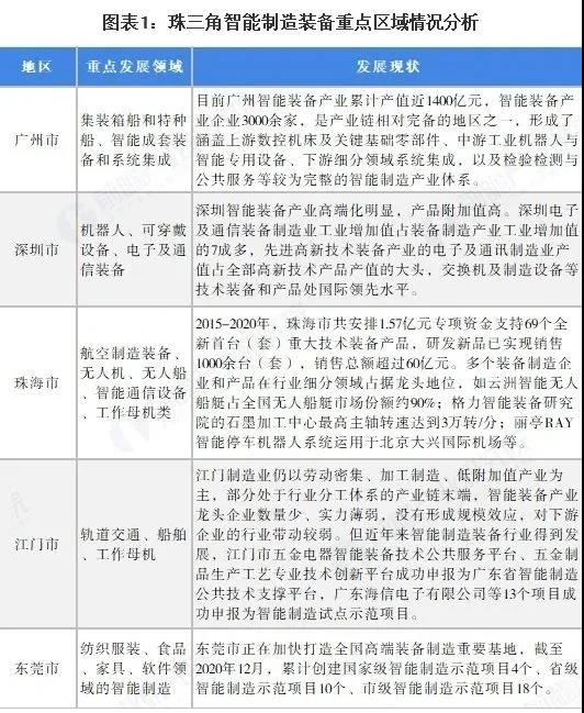 珠三角地區的智能制造裝備業主要分布在廣州、深圳、珠海和江門等地。其中,廣州市是國內最大的大中型集裝箱船和特種船建造基地;江門市是未來軌道交通行業領域的重要基地,珠海市依托珠海機場而建的珠海航空產業園涵蓋了航空制造業、服務業和臨空產業,是廣東省發展通用航空制造、維修及運營服務產業的唯一載體,已形成了“珠海航展”的知名會展品牌;深圳市正著力建設華南地區數控系統技術研究開發中心,大力發展工業機器人和機械手的研發與生產。