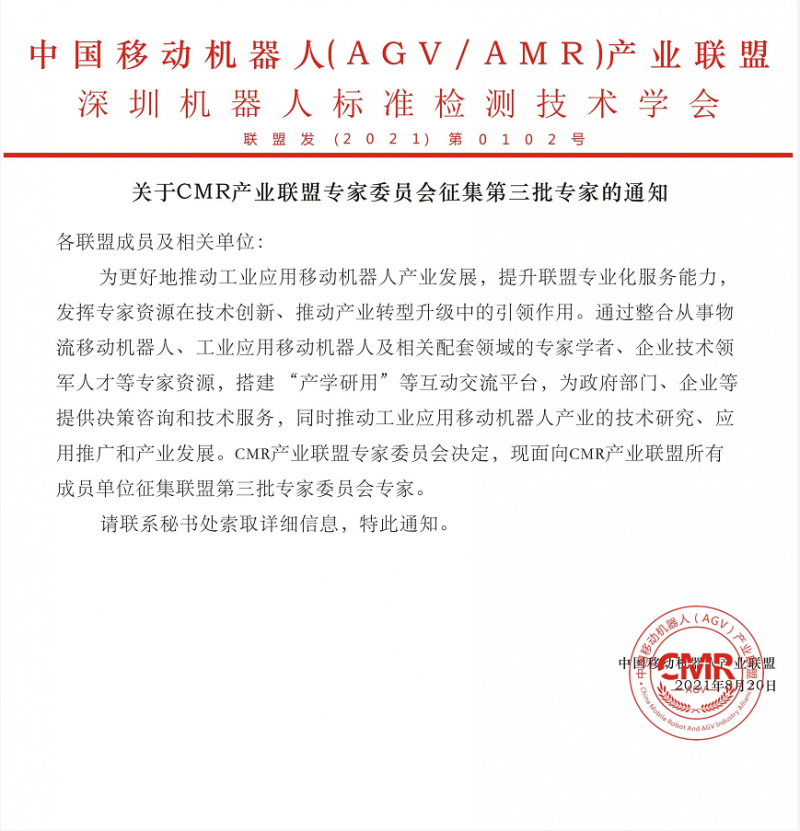 核心提示:中國移動機器人(AGV/AMR)產(chǎn)業(yè)聯(lián)盟專家委員會征集第三批專家的通知