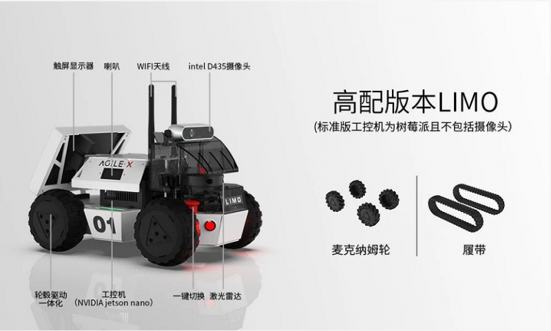 采用電機驅動一體化輪轂電機的配置也大大增加了車體平臺搭載空間,LIMO集成了包括激光雷達、深度相機、輪速計、觸屏顯示屏等超高性能傳感器。為便于用戶根據實際應用需求選配,LIMO提供了標準版和高配版兩個版本,主要區別在于控制模塊和深度相機配置。標準版采用的樹莓派Raspberry Pi,而高配版則搭載的是具有4核CPU和4G內存的NvidiaJetson nano開發板,同時高配版還搭載了英特爾深度相機D435, 可實現深度視覺V-SLAM功能,并能實現黑暗環境下的環境感知,有利于開發者學習地下管道等狹小黑暗空間的安全巡檢應用開發等。