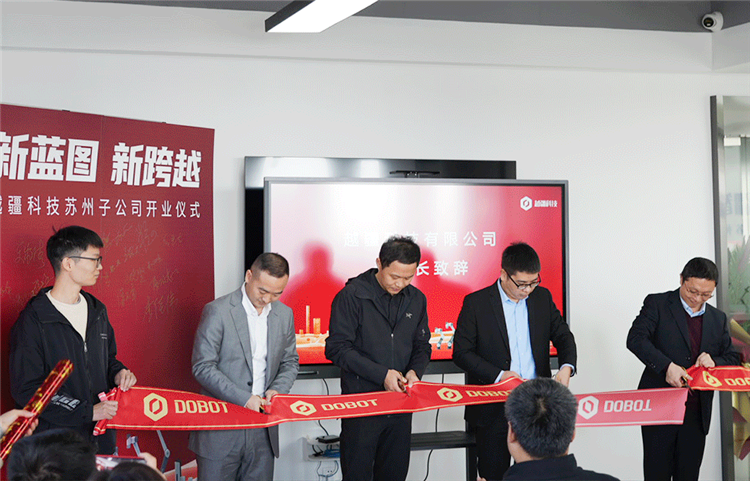 開業(yè)典禮上,深圳市越疆科技有限公司董事長兼CEO劉培超、越疆智能機(jī)器人(蘇州)有限公司總經(jīng)理劉主福、深圳市越疆科技有限公司工業(yè)事業(yè)部副總經(jīng)理劉曉明、深圳市越疆科技有限公司工業(yè)事業(yè)部商務(wù)運(yùn)營總監(jiān)李劉偉共同為越疆科技蘇州子公司揭牌剪彩。