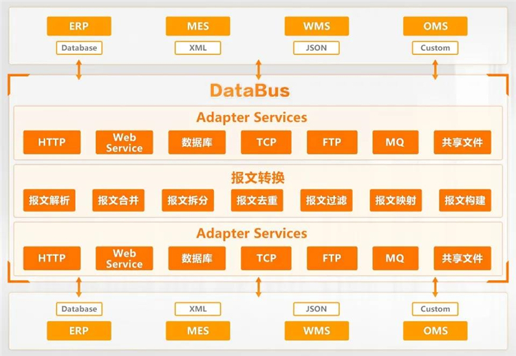 DataBus提供多個(gè)業(yè)務(wù)系統(tǒng)之間數(shù)據(jù)交互能力,支持HTTP/HTTPS/WebService/數(shù)據(jù)庫中間表/FTP/共享文件夾等多種通訊方式,支持JSON/XML等多種報(bào)文格式。